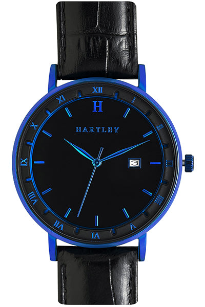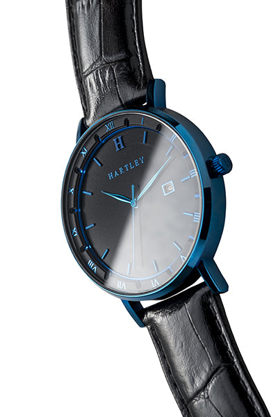 Let this beautiful timepiece by Hartley accompany you on all of your future voyages. Featuring an interchangeable black leather band, a blue case and dial + a black face with date function. This is a unisex timepiece that can be used in any format or occasion, both casually and formally.