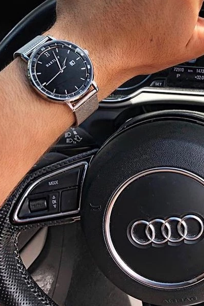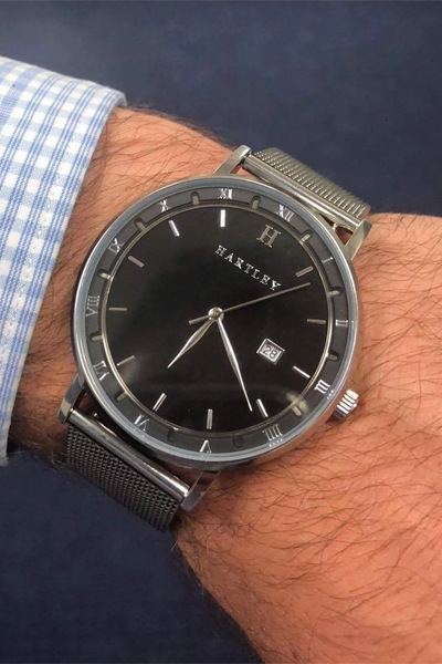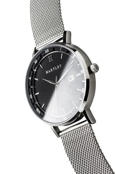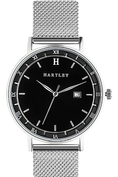 Let this beautiful timepiece by Hartley accompany you on all of your future voyages. Featuring a slick interchangeable silver mesh band, a silver case and dial + a black face with date function. This is a unisex timepiece that can be used in any format or occasion, both casually and formally.