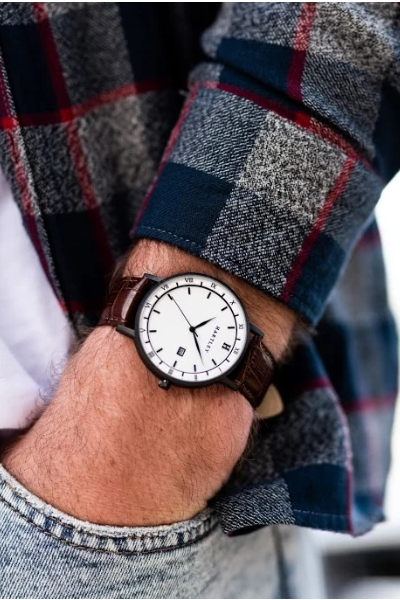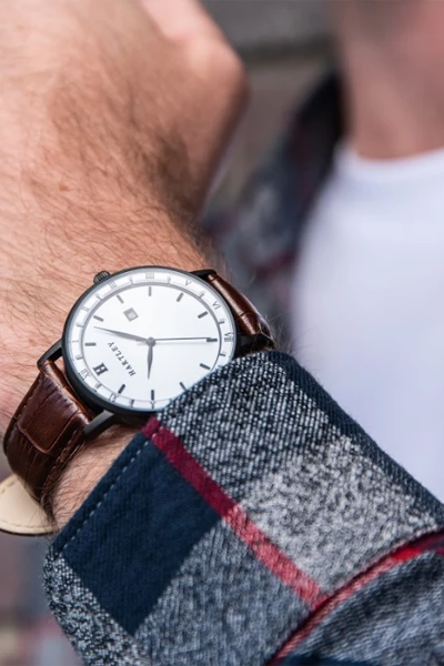 Let this beautiful timepiece by Hartley accompany you on all of your future voyages. Featuring an interchangeable dark brown leather band, a matte black case and dial + a white face with date function. This is a unisex timepiece that can be used in any format or occasion, both casually and formally.