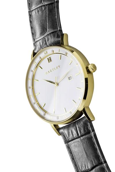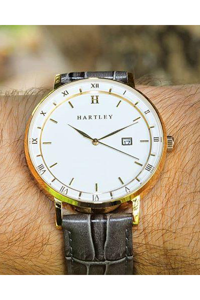 Let this beautiful timepiece by Hartley accompany you on all of your future voyages. Featuring an interchangeable grey leather band, a golden case and dial + a white face with date function. This is a unisex timepiece that can be used in any format or occasion, both casually and formally.